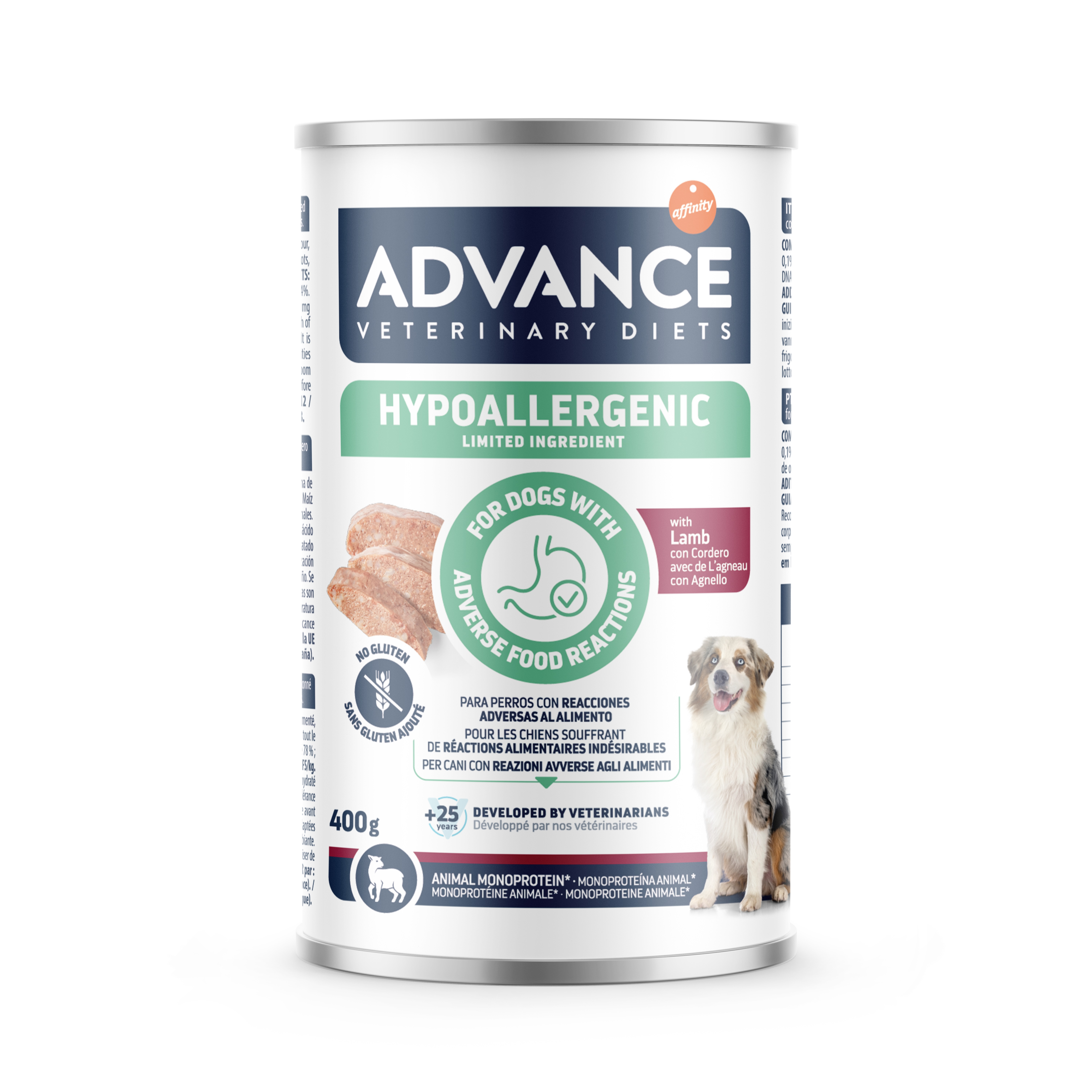 | ADVANCE VETERINARY DIET DOG Hypoallergenic LAMB 400gr - pilnvērtīga un sabalansēta diētiska mitrā barība, kas paredzēta visu izmēru suņiem ar alerģiskām reakcijām uz barību.
