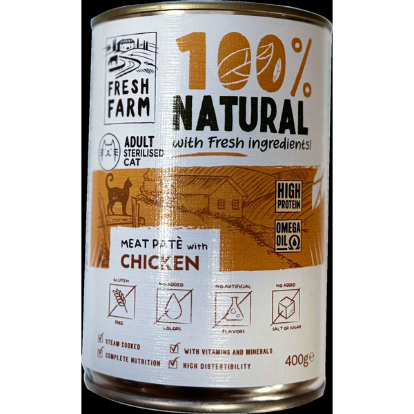 | PREFERA Fresh Farm CAT Smooth pate with chicken 400 gr- pilnvērtīga barība kaķiem, pastētes veida konservi kaķiem, ar vistas gaļu.   SASTĀVS: dzīvnieku izcelsmes produkti (vistas gaļa 96,5%), rīsi, laša eļļa, vitamīni un minerālvielas. Uzturvērtības piedevas: A vitamīns (3a672a) 4000 SV, D3 vitamīns (3a671) 300 SV; E vitamīns (3a700) 150 mg; holīna hlorīds 500 mg, cinks (3b605) 30mg, mangāns 5mg, DL-metionīns 1500mg, taurīns 800 mg; L-karnitīns 50 mg. ANALĪTISKĀS SASTĀVDAĻAS: kopproteīns 12%, koptauki 3%, kopsķiedras 1%, koppelni 2%, mitrums 80%  |