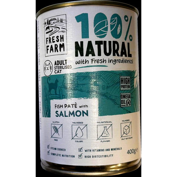 Prefera Fresh Farm CAT Smooth pate with salmon & fish 400gr - pilnvērtīga barība kaķiem, pastētes veida konservi kaķiem, ar lasi un zivīm.