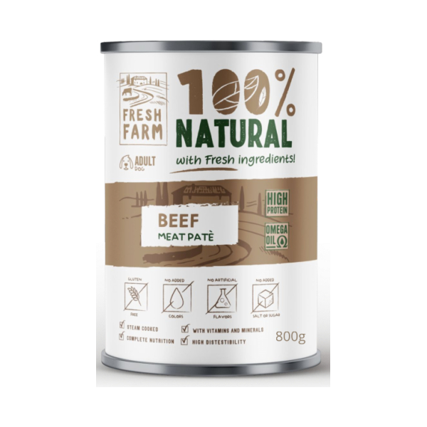 Prefera Fresh Farm DOG Smooth pate with beef 800gr - pilnvērtīga barība, pastētes veida konservi suņiem, ar liellopu gaļu.